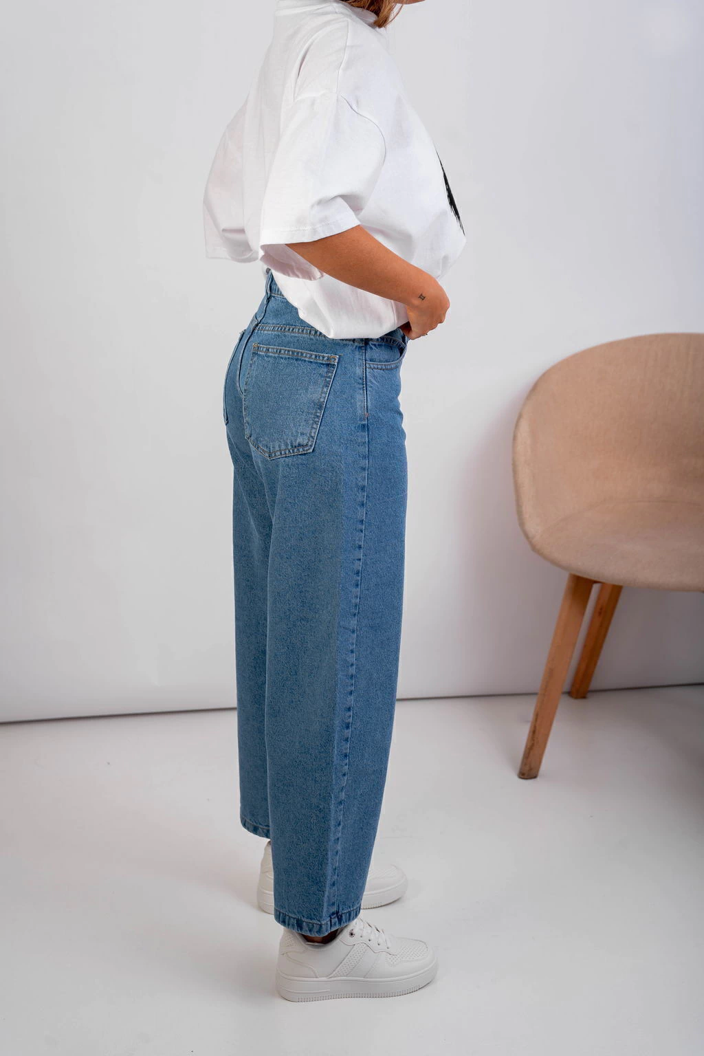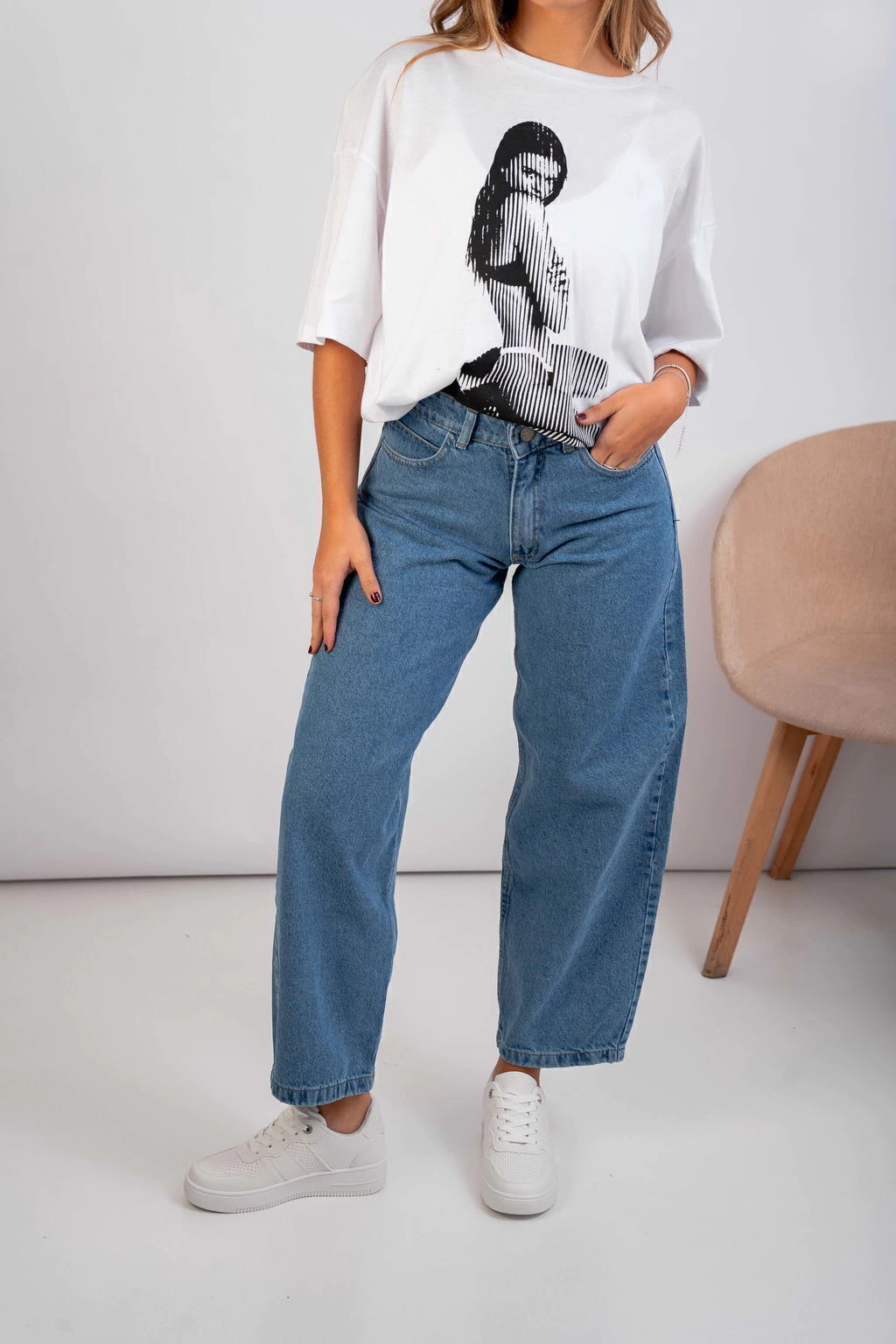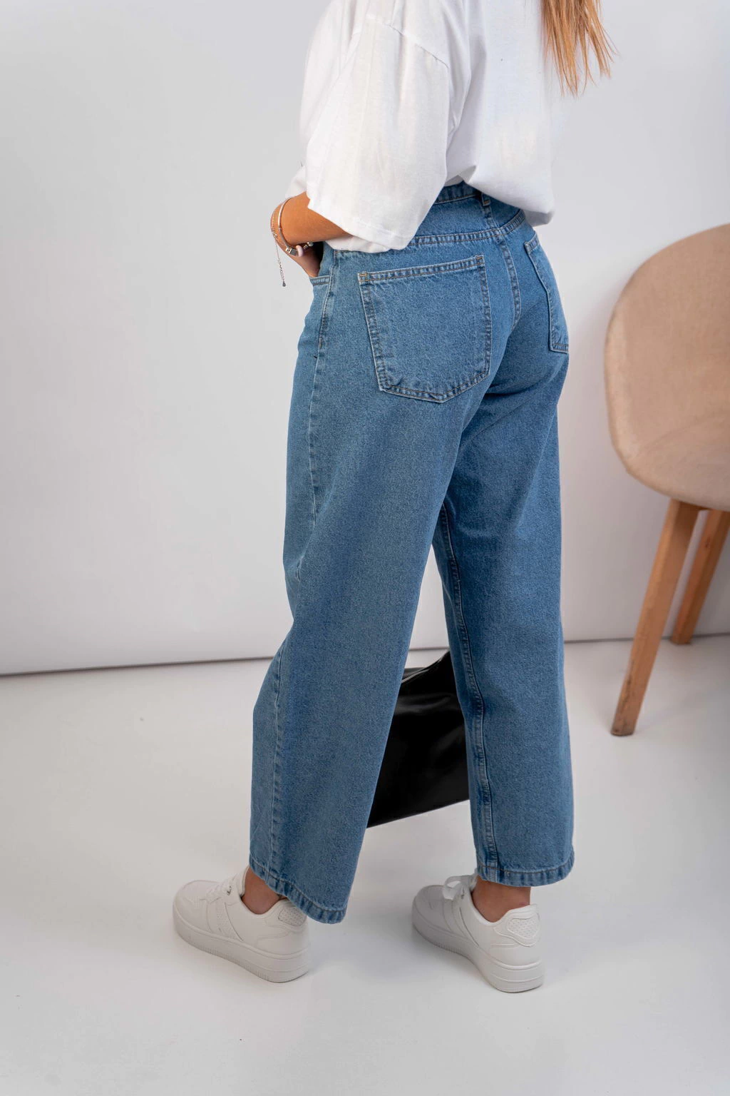• Baggy de jean rígido, con bolsillos, costuras camel y pasacintos.