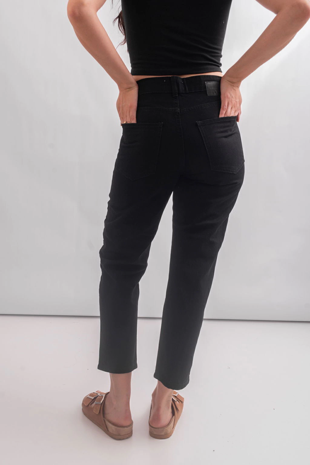 • Pantalón mom rígido, clásico con costuras a tono, pasacintos y bolsillos.