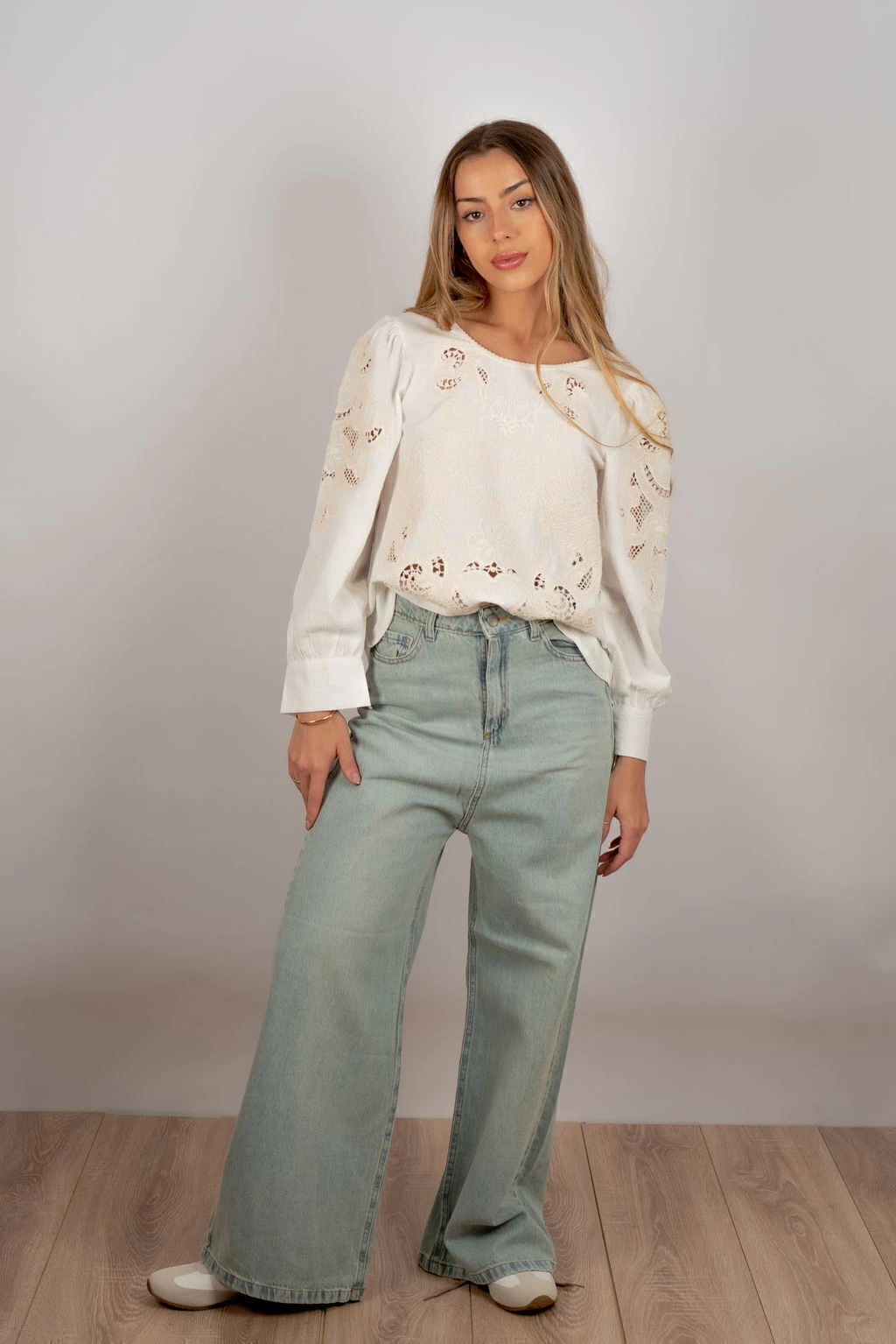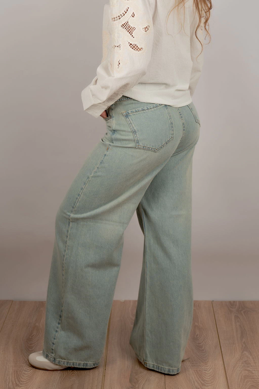 • Wide leg de jean rígido, de tiro caido, con costuras camel,, bolsillos, y diseño desgastado.
