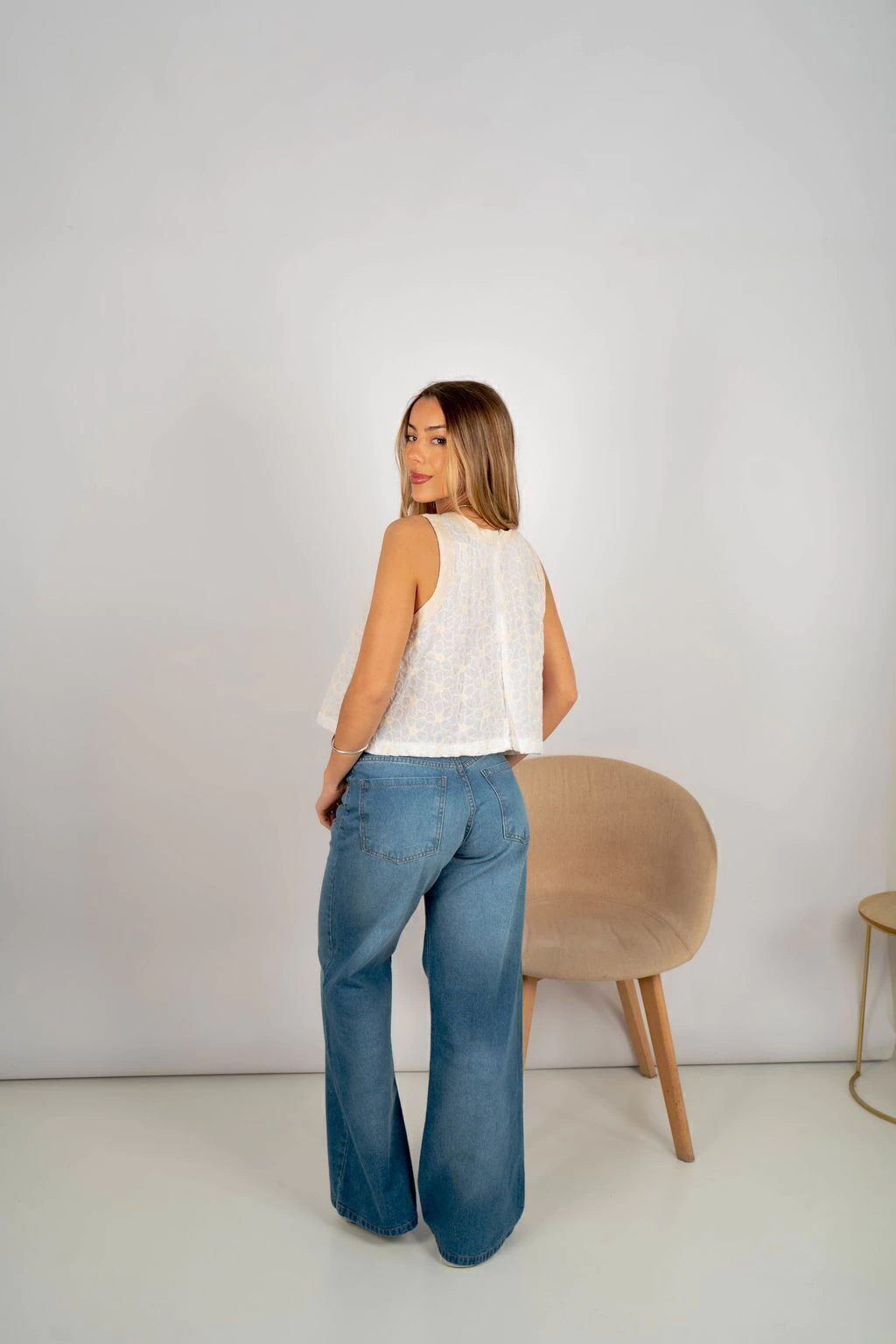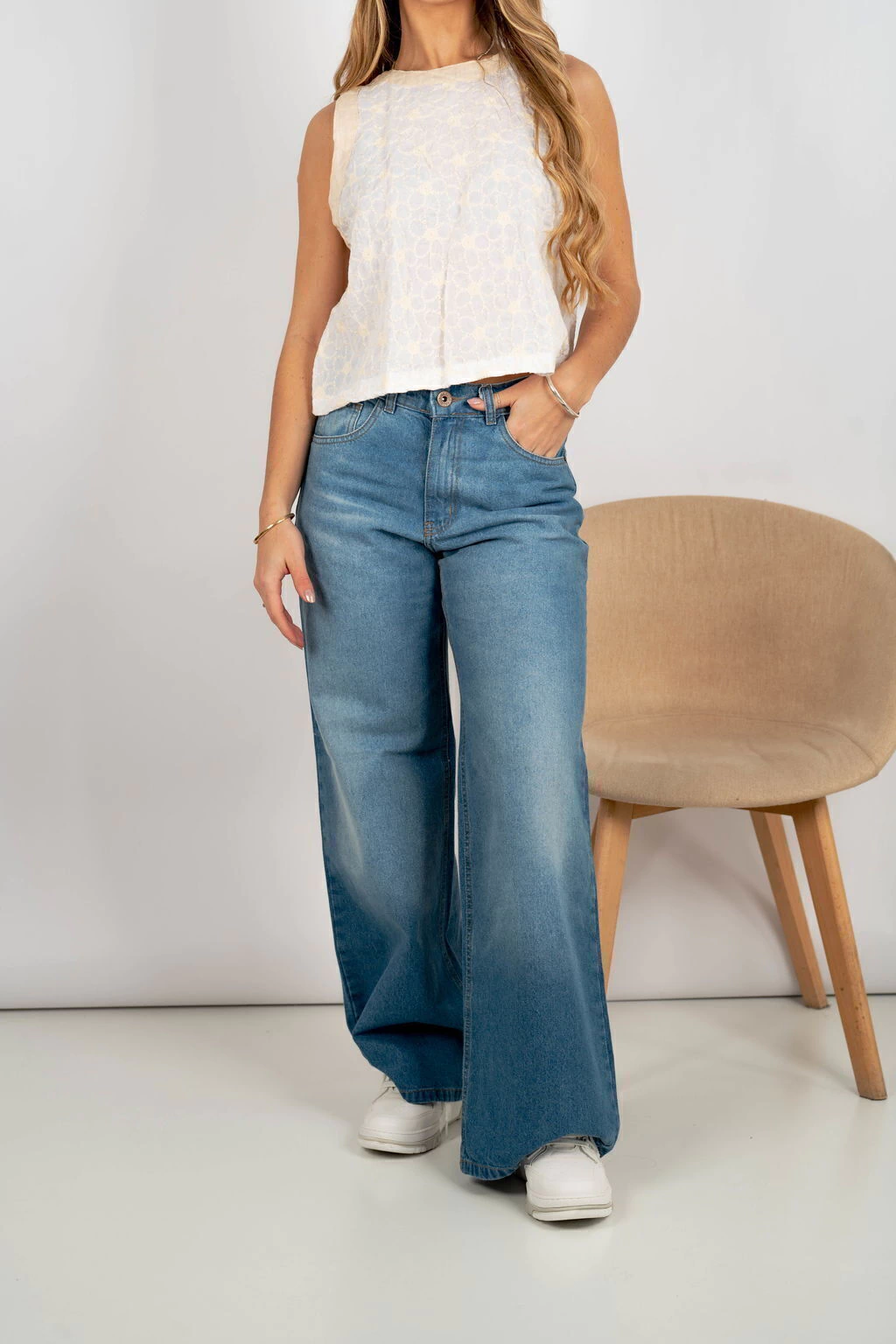 • Pantalón wide leg denim rígido, tiro alto, con bolsillos, costura y botón a tono.